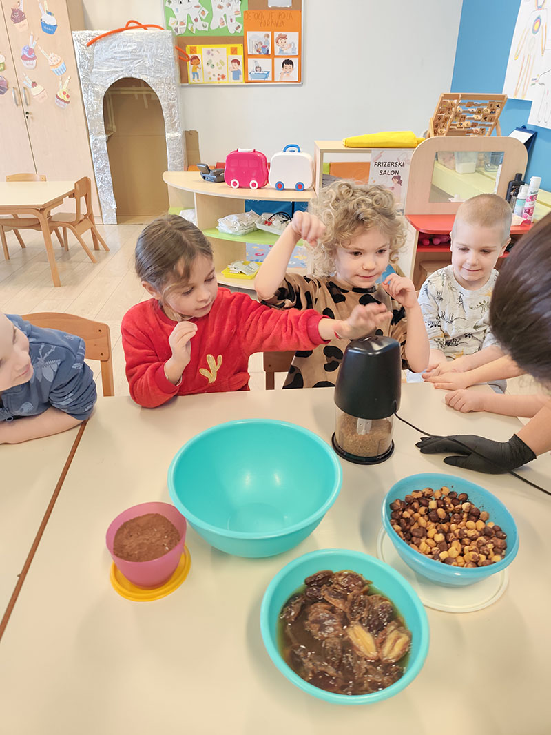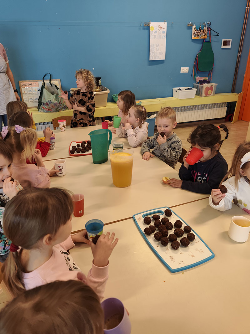 Siječanj je u našoj skupini mirisao na voće, kakao i zdrave kolačiće. U goste nam je došla gđa Novak, mama jednog dječaka, koja je s djecom pripremala prirodne sokove i zdrave kolačiće od jednostavnih i svima dostupnih namirnica.