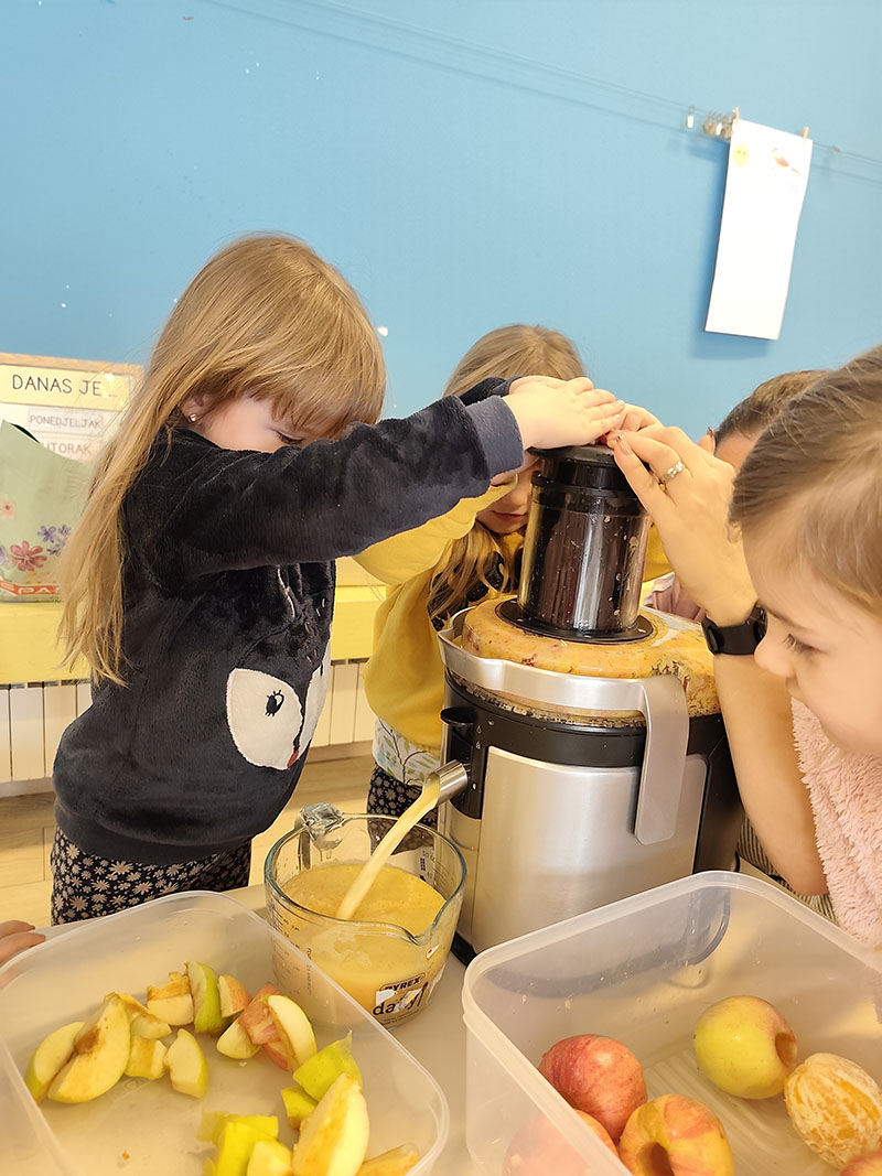 Djeca su s velikim zanimanjem razgledavala sastojke i promatrala kako se od voća i drugih namirnica pripremaju sokovi i kolačići. Sokovnik i blender izazvali su pravo oduševljenje, a promjene boje, mirisa i okusa potaknule su brojne komentare i pitanja.