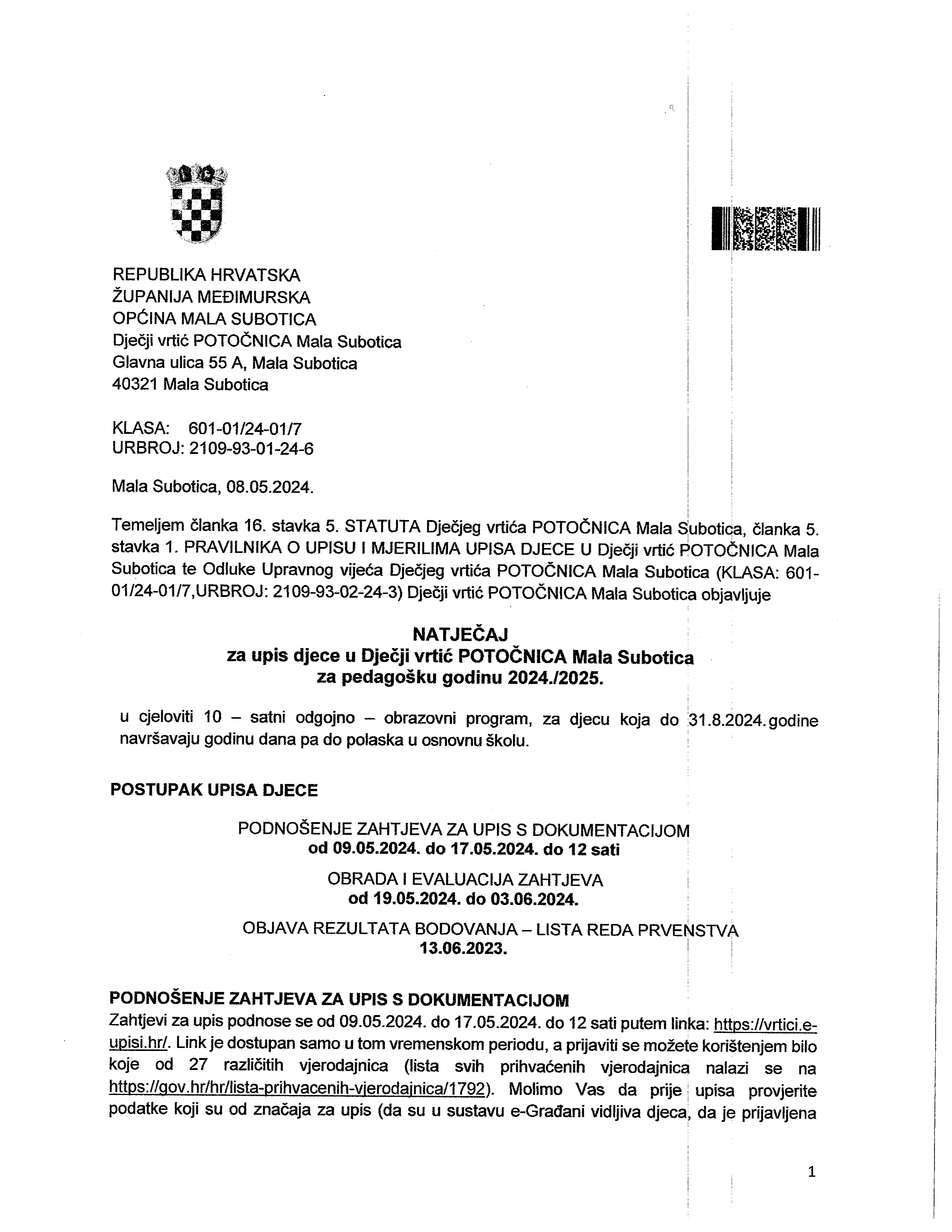 NATJEČAJ ZA UPS DJECE U Dječji vrtić POTOČNICA Mala Subotica za pedagošku godinu 2025.-2026..pdf