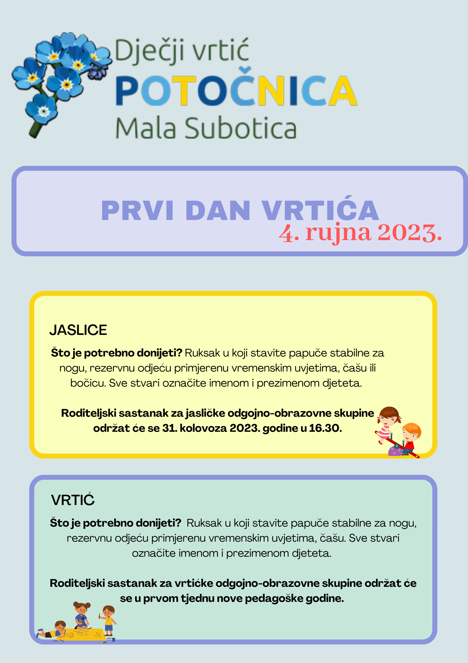 Prvi dan vrtića - 4. Rujna 20203. Preuzmite popis ODGOJNO - OBRAZOVNE SKUPINE ZA PEDAGOŠKU GODINU 2023.-2024. Prethodni članak: Rastimo zajedno na putu uspješnog roditeljstva - ciklus radionica Pret Sljedeći članak: RAD S LUTKOM - PERSONA DOLL U MLAĐOJ SKUPINI JEŽIĆI Sljedeće